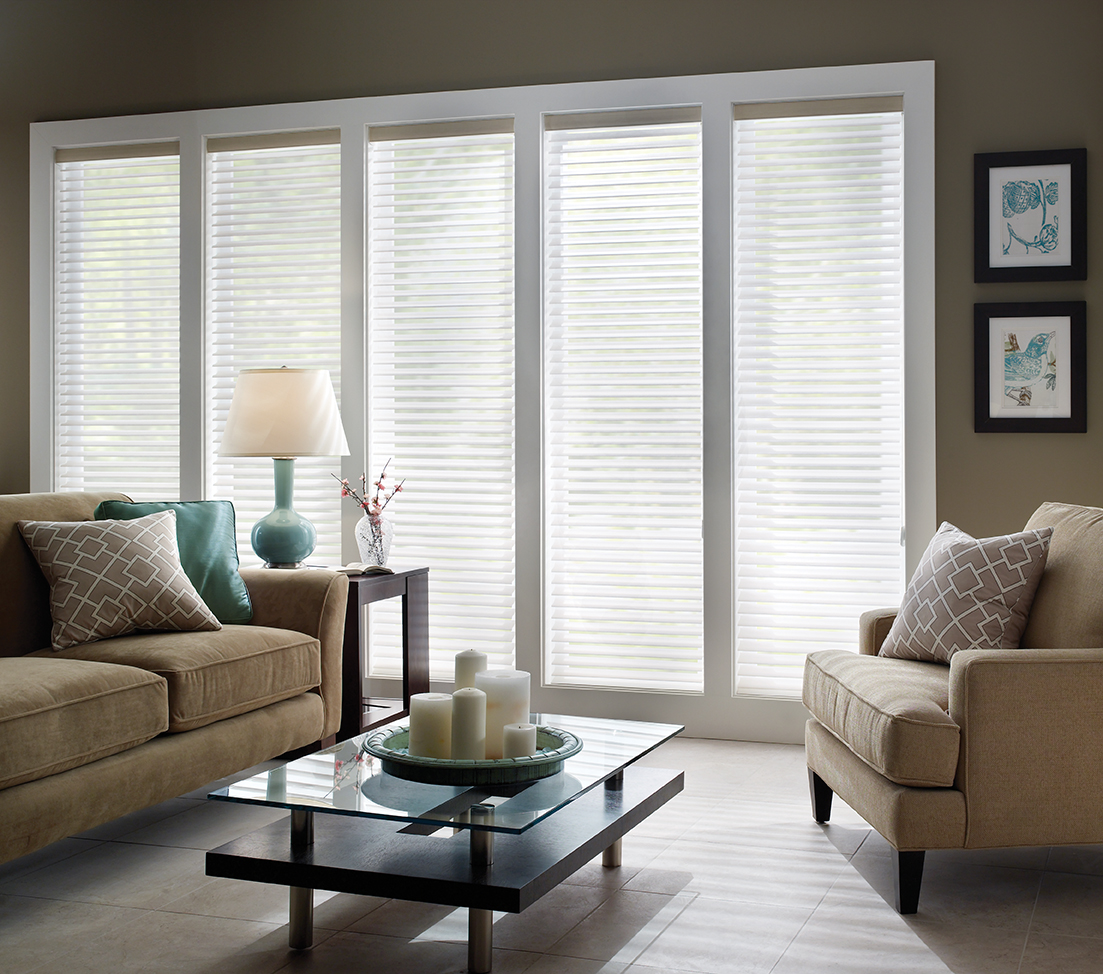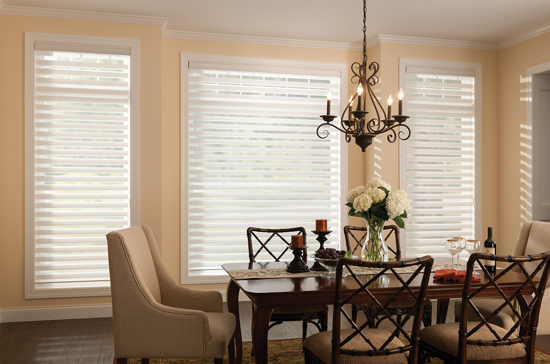 Sheer Shadings gently soften the incoming sun. The Shangri-La® fabric vanes are suspended between dual sheer layers, and tilt to adjust privacy, control light and minimize UV damage to interior furnishings. The exclusive Omni-View Hardware system does what no other sheer hardware can – raise the fabric up to 24″ with the vanes open – while allowing for a wide range of shading variations. Enjoy the view with cord loop, radio frequency motorization or our innovative cordless PowerTouch™ option.