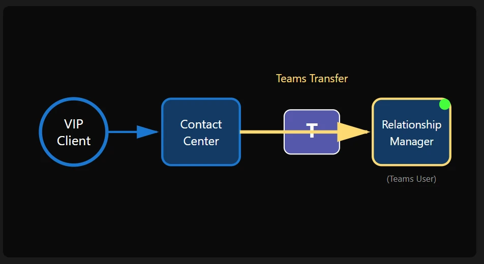A VIP client calls needing immediate portfolio guidance. The representative sees the Relationship Manager is active in Teams and transfers the call instantly.