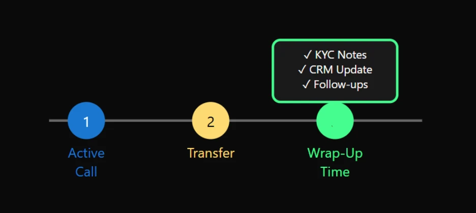 During this wrap up time, the representative can complete KYC verification, add investment-related notes, and schedule any required follow-ups without pressure from incoming work.