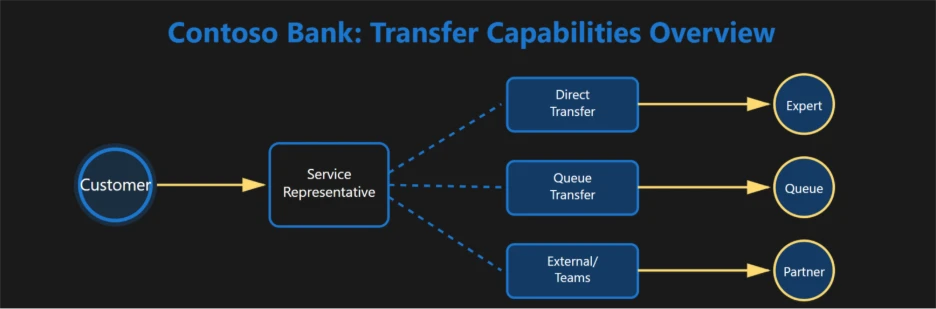 To see these transfer capabilities in action, let’s walk through a real-world example from financial services. Contoso Bank is a global financial institution known for its premium wealth management offerings. Its Wealth Desk Support team assists high value clients each day. They answer investment queries, clarify portfolio allocations, manage insurance-related questions, and coordinate with Relationship Managers and specialists across the bank. Their mission is simple: connect every client to the right expert instantly, with a service experience that feels seamless, personal, and trusted.