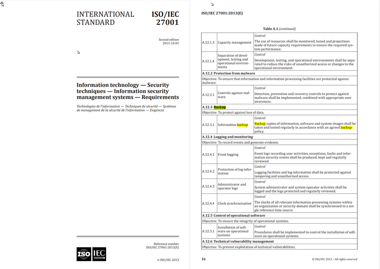 For example, the ISO/IEC 27001:2013(E) Information technology — Security techniques — Information security management systems — Requirements states in section A.12.3.1