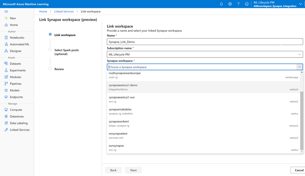 Customers can leverage existing Spark pools from Azure Synapse Analytics (Azure Synapse) in Azure ML by just linking their Azure ML and Synapse workspaces via the Azure ML Studio, the Python SDK, or the ARM template. Customers just need to follow the widget in UI or leverage a few lines of code as described in the documentation here.