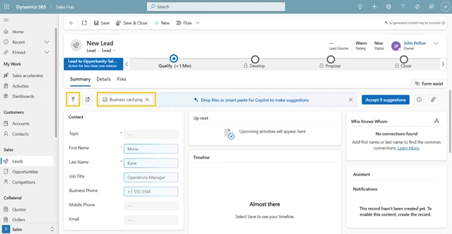 With Files (Preview), sellers can upload images of business cards or documents such as .txt, .docx, .csv, .pdf, .png, .jpg, .jpeg, or .bmp, directly into the form. The system analyses the uploaded files and suggests values for relevant fields, including names, titles, company details, email addresses, and phone numbers. Sellers simply review and confirm the suggestions, turning what once took hours into minutes.