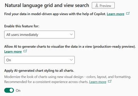 - Under Natural language grid and view search, set Enable this feature for to All users immediately