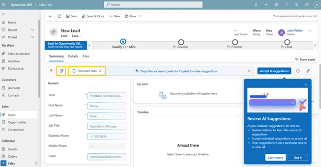 With Smart Paste (Preview), sellers can copy the email content, navigate to the lead or contact form. The system analyzes the copied text, extracts key details such as name, company, email, and phone number, and suggests values inline for the relevant fields. Each suggestion includes inline citation from the email, so sellers can clearly see the source of the information.