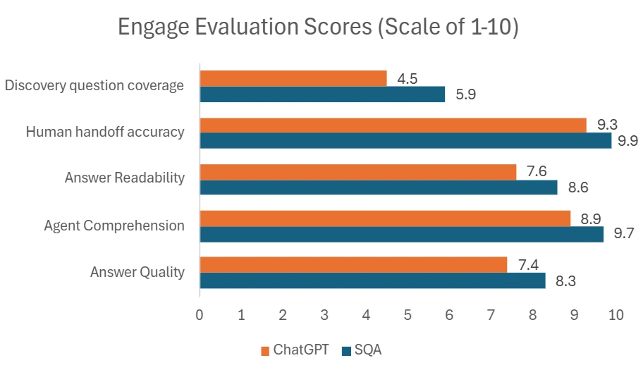 Engagement: Sales Qualification Agent’s email responses to engage a lead over a multi-turn conversation scored 16% higher than ChatGPT’s. SQA generated emails that responded to the lead’s questions with accurate answers that develop their purchase interest and with precise discovery questions that qualify the lead before handing off to a seller.