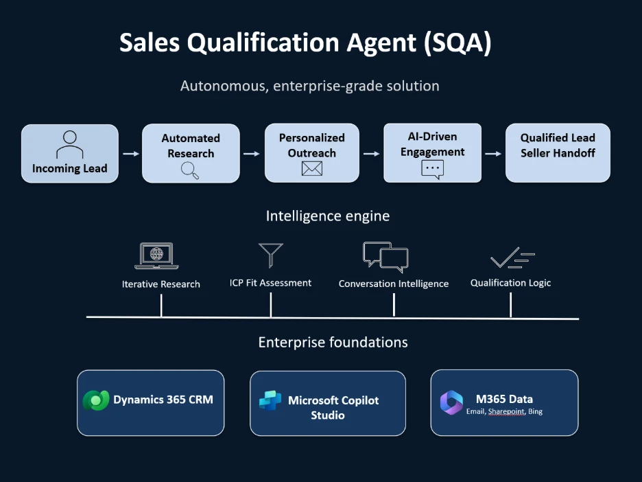 The Dynamics 365 Sales Qualification Agent (SQA) architecture is designed as an end-to-end, enterprise-grade AI system that autonomously researches leads, synthesizes insights, and generates seller-ready outreach. It combines an intelligence engine powered by large language models with iterative web and enterprise data research, tightly integrated with Dynamics 365 Sales and Microsoft Copilot Studio for orchestration. Built on secure enterprise foundations, the architecture enforces governance, compliance, and data protection while enabling scalable, trustworthy AI-driven sales workflows.