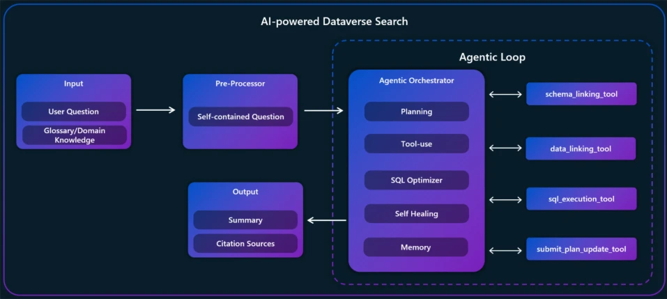 We’ve reimagined the technology behind Dataverse Search from the ground up. Leveraging recent breakthroughs in agentic AI, the new system delivers answers that are more relevant, contextual, and accurate to your specific business data. Think of it as an intelligent assistant that not only understands your question but figures out the best way to answer it using an adaptive reasoning process.