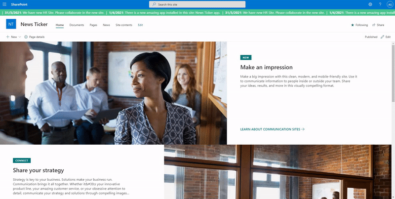 You might be familiar with the running text that shows some breaking news on a news tv channel. I think it would be nice if we have a similar thing on a SharePoint site to show some breaking news to its users so I created the News Ticker app. Basically, the app will show some news from a SharePoint list as a running text at the top of every modern page on the site. Below is how it looks: