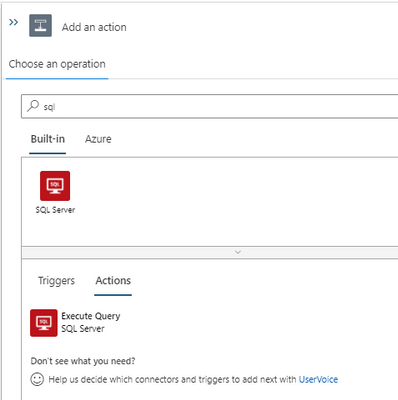 Add an action and search for SQL. We can see two connector options. Built-in and Azure.