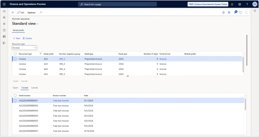 Once enabled, Türkiye-specific fields and user interface elements become available within the legal entity. For example, you can configure serial prefixes and enable continuous serial numbering of various documents, such as sales invoices or product receipts for purchase return orders.