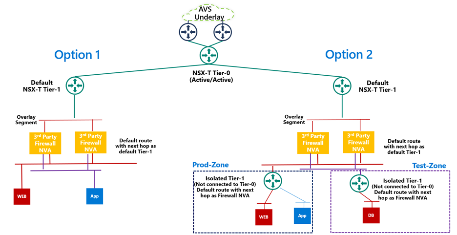 - Option 1: Workload segments are directly connected to the firewall and the gateway on workloads is 3rd party firewall. This topology restricts the users with numerous segments as the vNICs on the NVA becomes a limiting factor.