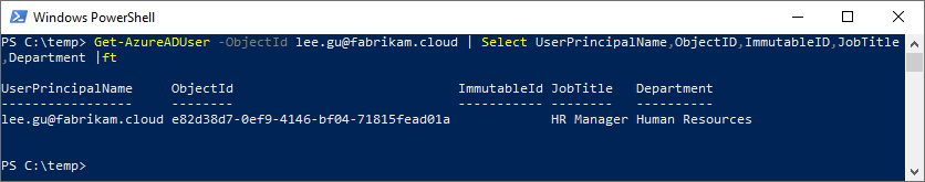 After our Azure AD Connect delta sync, let’s examine the results of the soft-match by mail. Because the UPN has changed, in AAD we must either query by the ObjectId or the updated UPN for our results.