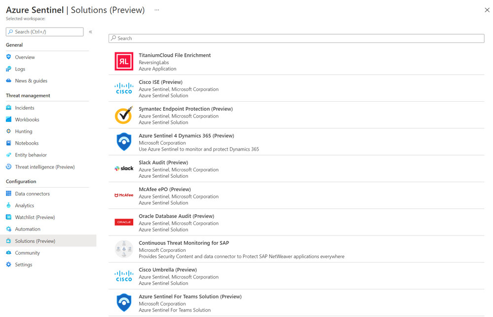 Select from the rich set of 30+ Solutions to start working with the specific content set in Azure Sentinel immediately. Steps to discover and deploy Solutions is outlined as follows. Refer to the Azure Sentinel solutions documentation for further details.