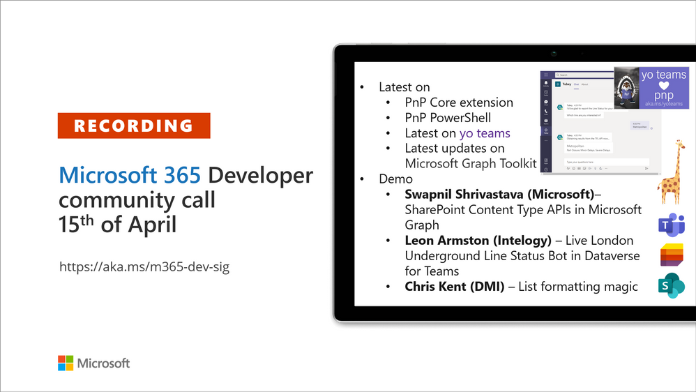 Recording of the Microsoft 365 – General M365 development Special Interest Group (SIG) community call from April 15, 2021.
