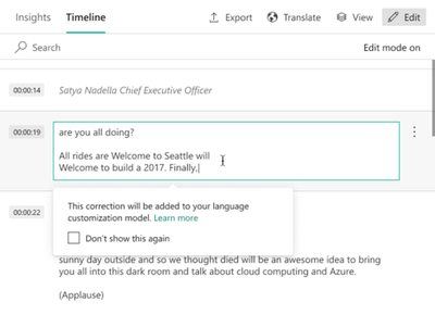 Once a video is indexed in VI, customers can use the Video Indexer portal to introduce manual edits and fixes to the automatic transcription of the video. This can be done by clicking on the Edit button at the top right corner of the Timeline pane of a video to move to edit mode, and then simply update the text, as seen in the image below.