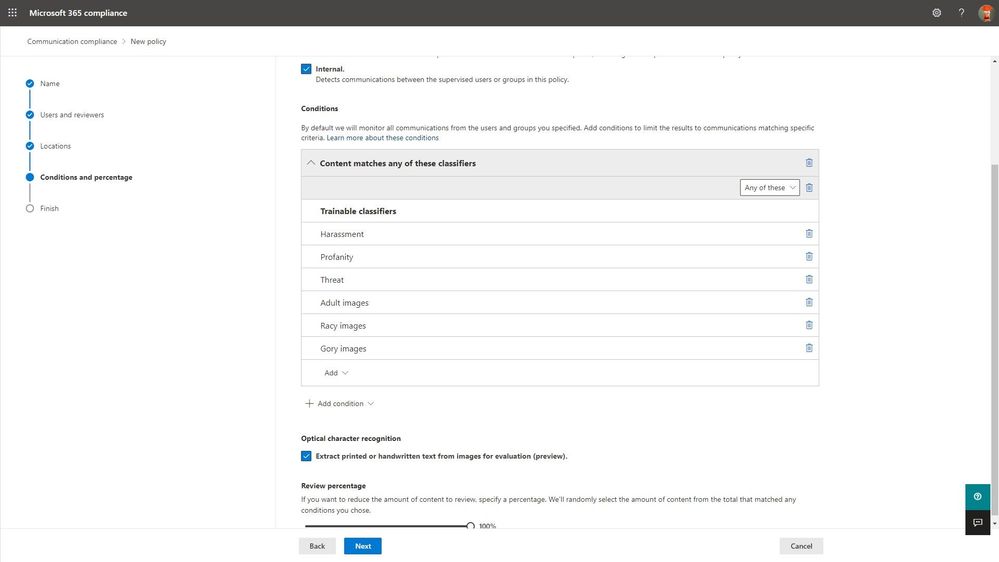 Additionally, we are introducing the ability for customers to detect compliance violations in images by extracting printed or handwritten text using Azure’s Computer Vision Optical Character Recognition (OCR). With OCR, text extracted from images or PDF will then be evaluated against the customer’s policy conditions (such as keywords matches for threatening language), further reducing an organization’s policy violation risk.