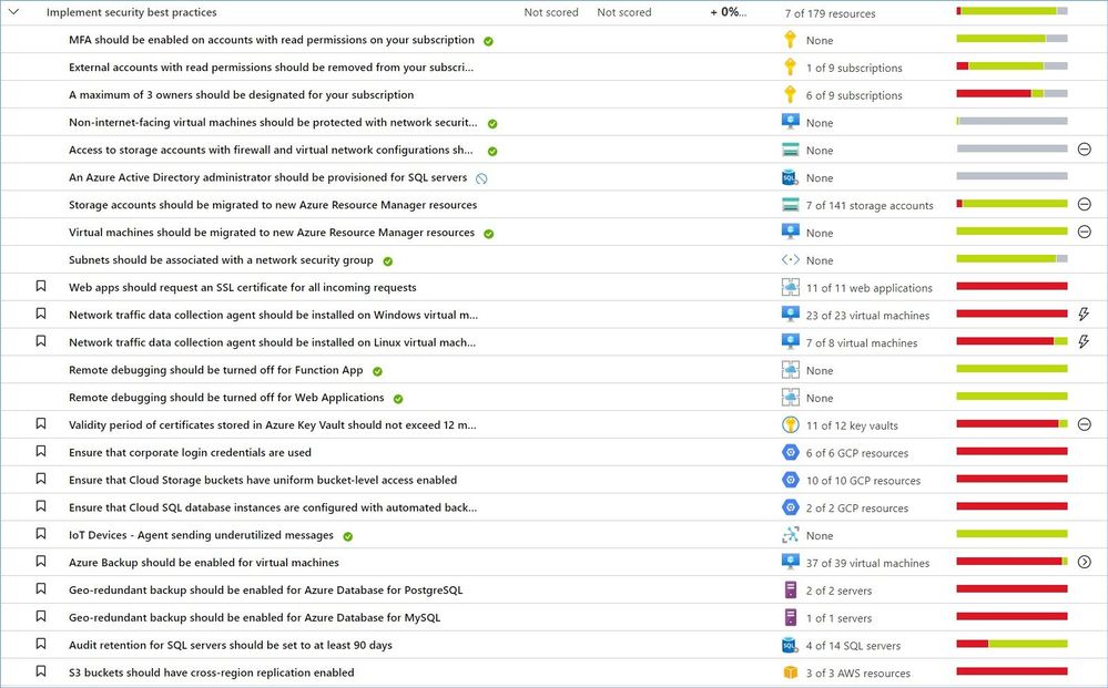 “Implement security best practices” is the largest control that includes more than 50 recommendations covering resources in Azure, AWS, GCP and on-premises. This list constantly gets updated as our teams add new resources and discover new attack technics, vulnerabilities, and risky misconfigurations.