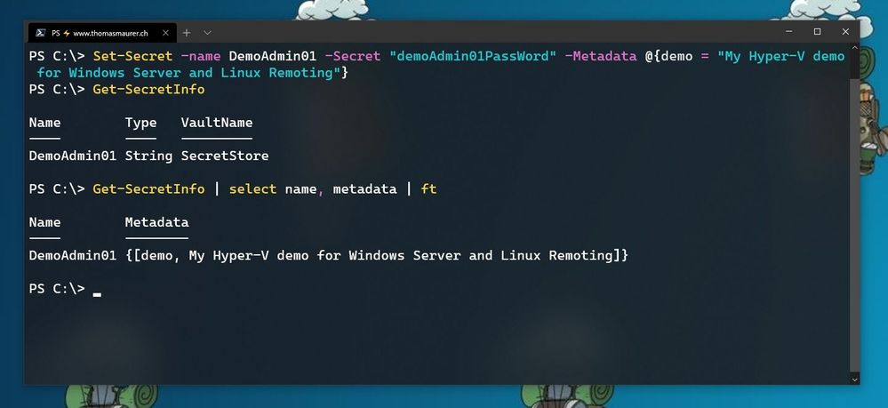 Set-Secret -name DemoAdmin01 -Secret "demoAdmin01PassWord" -Metadata @{demo = "My Hyper-V demo for Windows Server and Linux Remoting"}