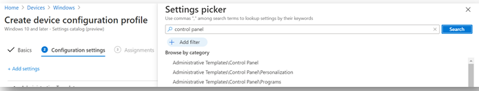 - The device configuration settings catalog has been updated to list thousands of settings that previously were not available for configuration via MDM (Figure 1). You will see these as being marked as available for Windows Insiders only. These include settings from Windows components like Control Panel (Figure 2), which are critical for security and desktop standardization.
