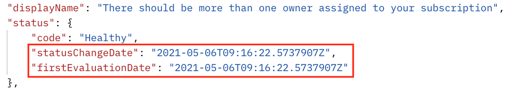 Time indicators within that context are stored in the properties.status.firstEvaluationDate and properties.status.statusChangeDate fields. The query above has also been published to our Azure Security Center Github repository where you can always find the latest version.