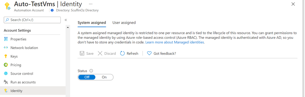 Adding a system-assigned managed identity to your Azure Automation account – Identity blade inside the Azure Portal